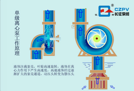 單級(jí)離心泵主要適用于工農(nóng)業(yè)及城市、排水、消防供水等。該泵的傳動(dòng)方式是通過(guò)加長(zhǎng)彈性聯(lián)軸器與電動(dòng)機(jī)聯(lián)接的。泵的旋轉(zhuǎn)方向,從驅(qū)動(dòng)端看,為順時(shí)針?lè)较蛐D(zhuǎn)。以下著重介紹下單級(jí)離心泵的工作原理。