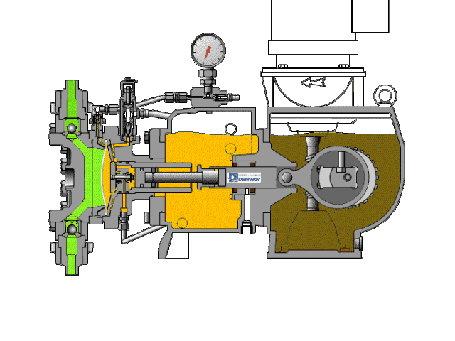 隔膜泵的缸蓋主要由隔膜隔開,以將待輸送的液體與工作流體分開。當(dāng)隔膜移動到傳動機(jī)構(gòu)的一側(cè)時,泵缸中的工作室會在負(fù)壓下抽吸液體。當(dāng)隔膜移動到另一側(cè)時,然后排出液體。待輸送的液體通過泵缸中的隔膜與工作流體分離,并且僅與泵缸,吸入閥,排放閥和隔膜的內(nèi)側(cè)接觸,而沒有與柱塞和密封裝置接觸,因此重要部件例如塞子完全在含油介質(zhì)中工作,并且可以處于良好的工作狀態(tài)。下圖顯示了隔膜泵的工作狀態(tài)。